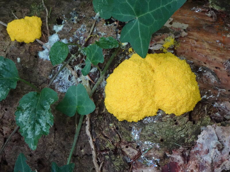 In het Luitzenpark kun je een interessante verschijning tegenkomen: heksenboter, ook bekend als runbloem (Fuligo septica). Deze felgele slijmzwam uit de familie Physaraceae trekt aandacht dankzij zijn plasmodium, een beweeglijke, levende massa die vaak een glanzend spoor achterlaat. Heksenboter voedt zich met micro-organismen en groeit voornamelijk op dood hout, hoewel het soms ook binnenshuis op muren kan verschijnen. Wanneer de zwam in een omgeving komt met weinig voedsel of water, verandert zijn uiterlijk aanzienlijk.