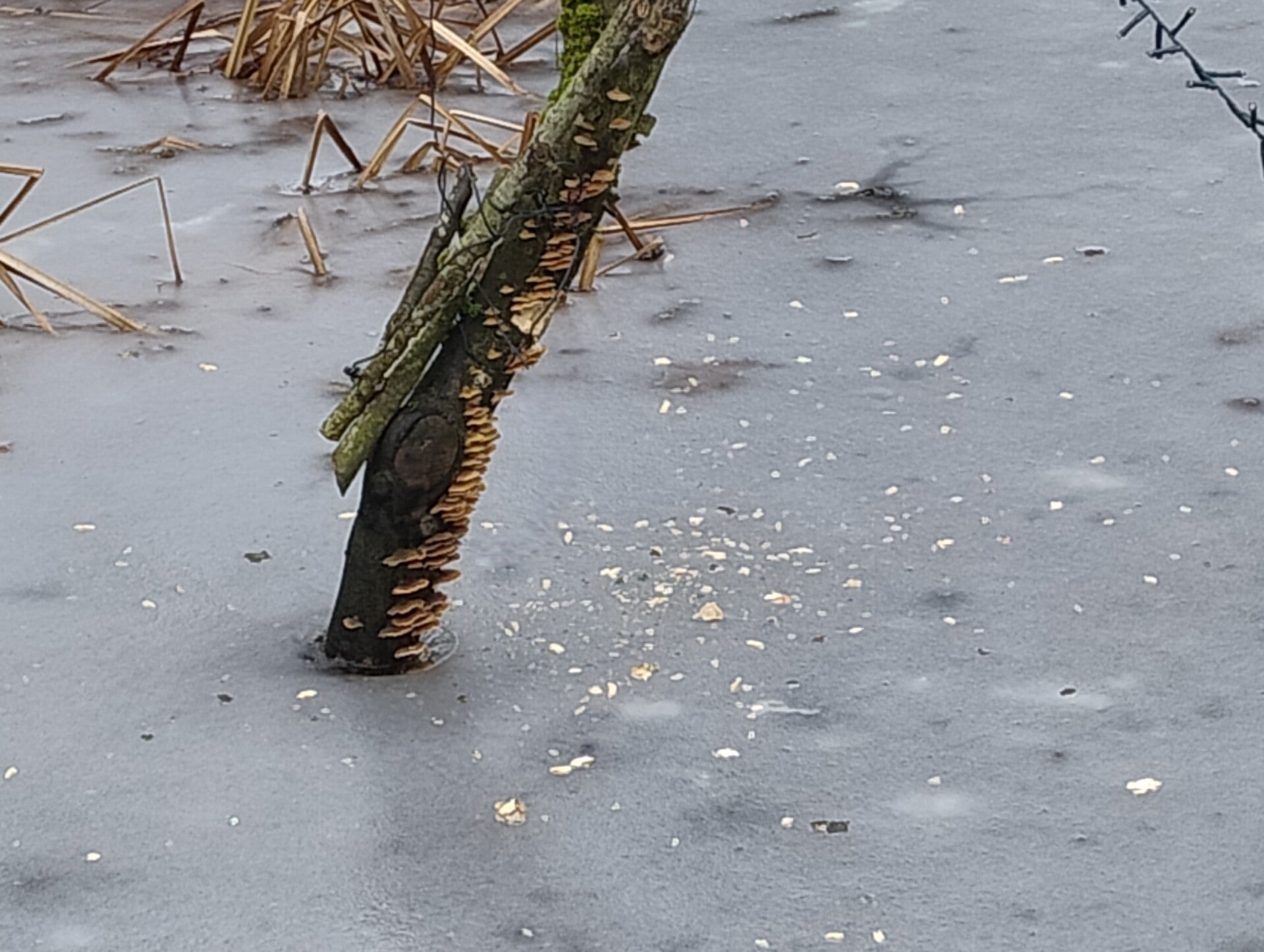 Hij was al druk bezig geweest een gat te hakken in de paal; het ijs lag er letterlijk vol mee.